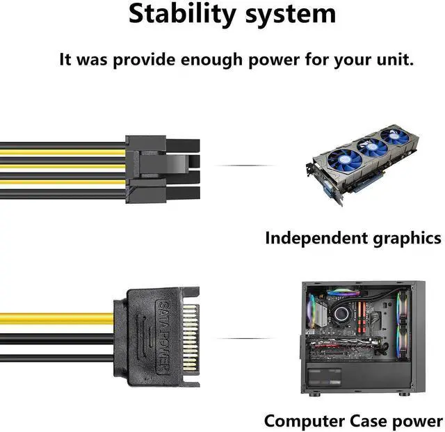 This dual SATA 15pin to 8pin (6+2) PCIe power adapter cable provides a reliable power solution for graphics cards. Dual SATA power input ensures sufficient and stable power supply to avoid overload risk. The flexible and compact build fits most desktop chassis, simplifying cable management for DIY builds and hardware renovations. Reinforced connectors prevent loose contact during long-term operation. Plug and play for easy installation, ideal for GPU replacement, computer assembly and hardware power expansion.