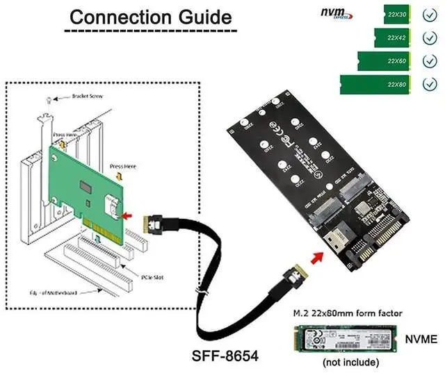 1. One M.2 PCIe SSD in 2280, 2260, 2242 and 2230 format can be connected and used as a replacement for a 2.5 HDD. The converter can be installed into the system internally through the SFF-8654 Slimeline interface.