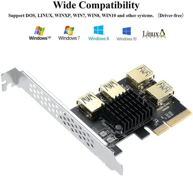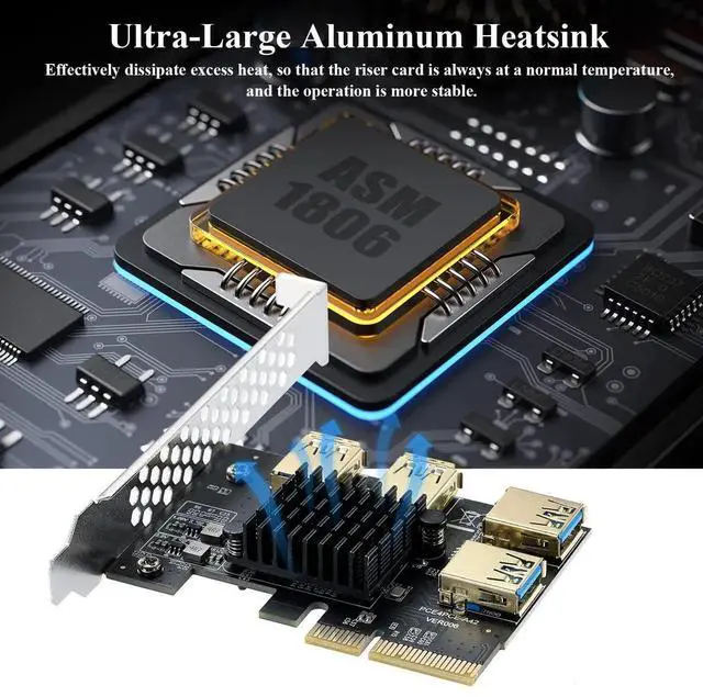 Step II: Close the motherboard PCI-E slot on. Use a USB 3.0 data cable adapter to connect the ends of the 4 USB ports and connect the power adapter.
