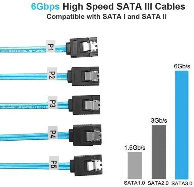 Straight SATA to SATA 7 Pin Female designe, build with high speed thin sata cable for better singnal performance,5x sata cable are labeled P1 to P5 for easy to route for different SATA systems or for RAID configuration, make for better cable management in tight space,each SATA connector with Locking latch for secure connection