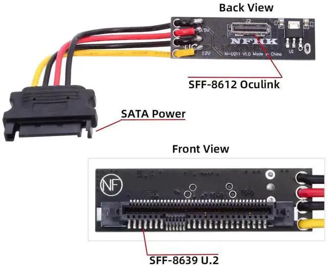 Connectors: 1 x OCuLink SFF-8612 female and 1 x SFF-8639 U.2/U.3 female and 1 x SATA power.
