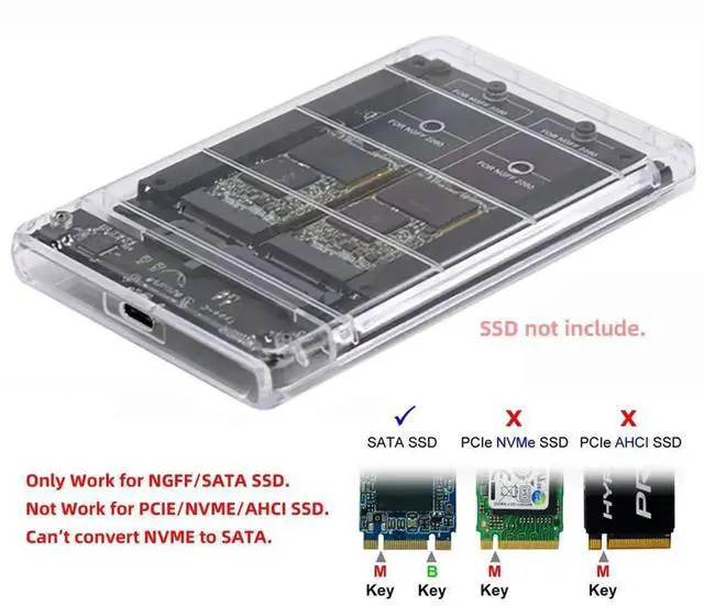 Support NGFF B+M-Key M.2 SSD.Not work for M-key NVME PCI-E SSD. You can connect it to desktop or laptop. Dual NGFF B+M-Key M.2 can work at one SSD with JOBD Raid Mode.