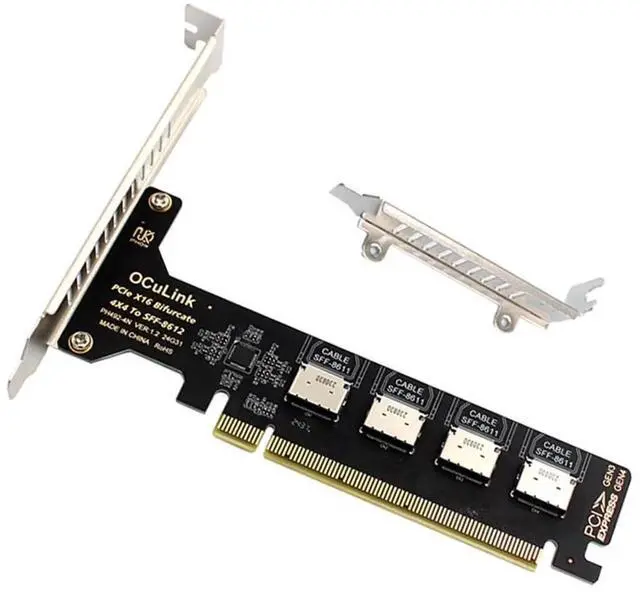 Connectors:four internal OCuLink SFF-8612 female and 1xPCI Express; with standard length and low profile bracket.One detachable PCIE PCI-Express motherboard can be connected,The converter can be installed into the system internally through the oculink interface.
