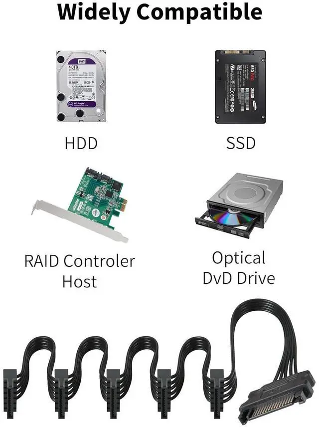 Important Compatibility NoteThis splitter features 1x 15-pin SATA male and 5x 15-pin SATA female connectors, specifically designed for devices with SATA ports. It is not compatible with other port types; connecting to incompatible devices may lead to component damage. Please verify your device's port compatibility before purchasing or feel free to reach out to us for assistance.