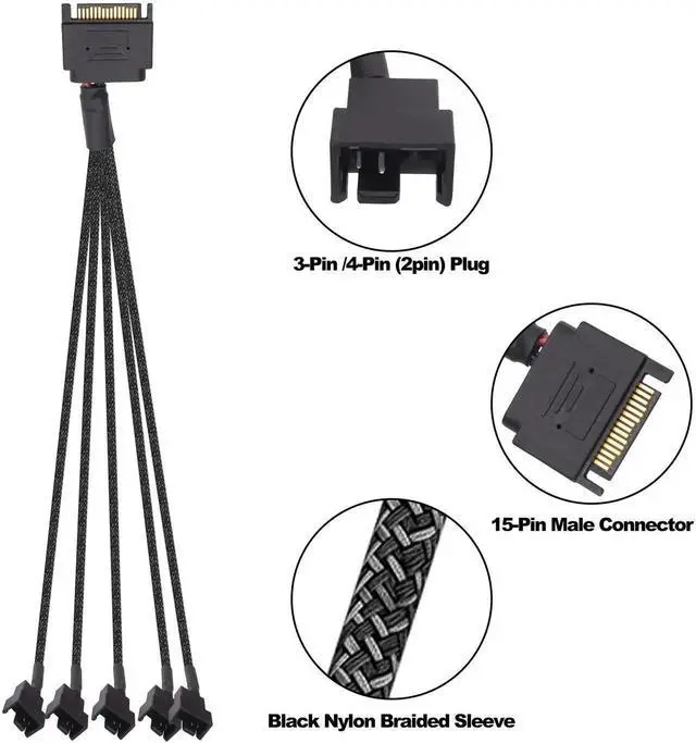 1. SATA Male to 5pcs 3 /4 pin PC case fan cooling power cable is used to extend and expand 3Pin/4pin interface for the motherboard,help to save space for PC case and support power multiple computer fans from one SATA connection.