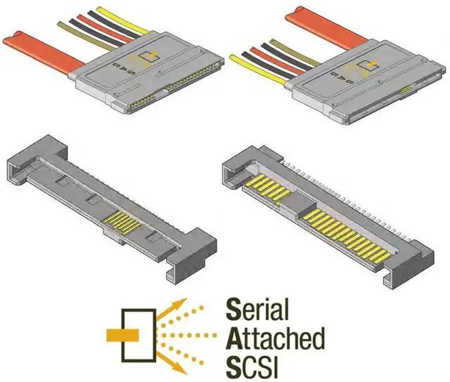 The SFF-8482 is a 29-pin connector with a plastic body, and configured with 15 pins that support the power requirements of the drive, and (2) groups of 7 pins that carry the SAS data signals. The SFF-8482 supports 2 SAS ports (lanes) to/from the drive.