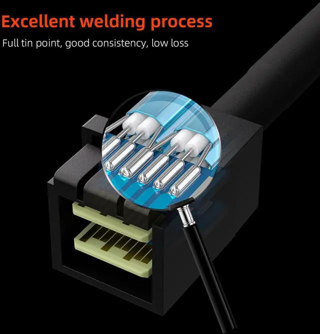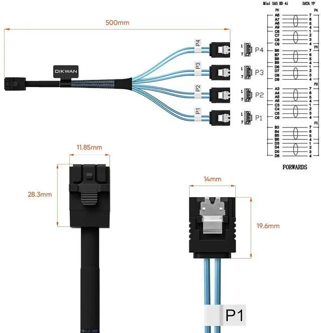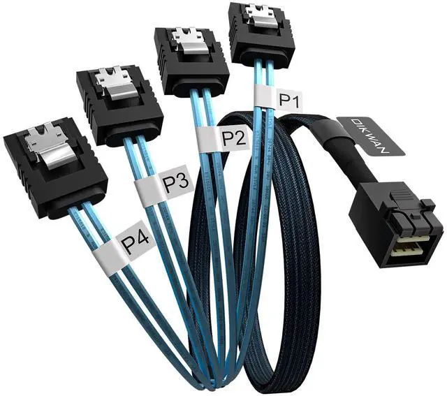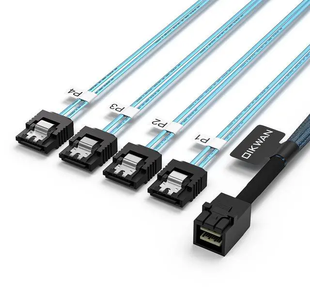 HD mini SAS breakout cable designed with acetate cloth tape over slim ribbon cables for strain relief to protect cables without rigidity; Woven mesh sheath covers half of the cable for easy routing; P1 to P4 markers provide easy ID after installation; Low profile SATA connectors have easy-grip treads with stainless steel latches to prevent accidental disconnection and reduce vibration.