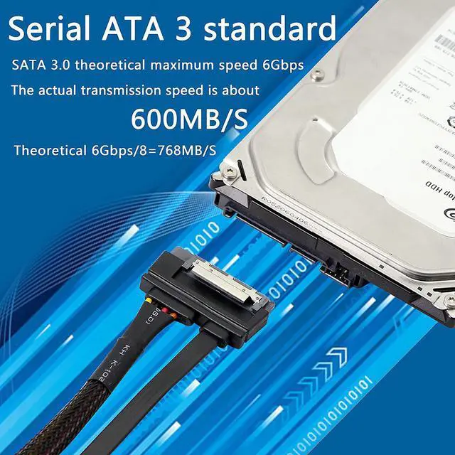 22 Pin SATA Data and Power Extension Cable: SATA 3.0 theoretically maximum Data transfer rate is 6Gbps. The actual transmission speed is about 600MB/STheoretical 6Gbps/8=768MB/S