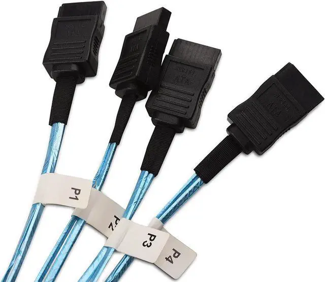 Flexible design of HD mSAS breakout cable includes acetate cloth tape over slim ribbon cables for strain relief to protect cables without rigidity; Woven mesh sheath covers half of the cable for easy routing; P1 to P4 markers provide easy ID after installation; Low profile SATA connectors have easy-grip treads with stainless steel latches to prevent accidental disconnection and reduce vibration