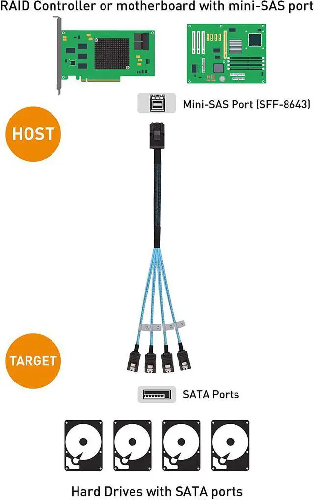 Internal HD Mini SAS cable is specifically designed to connect a 12 Gbps host bus adapter or RAID controller with SFF-8643 to 4 discrete SATA drives; Mini SAS HD to SATA adapter cable provides reliable internal connectivity between a high density RAID controller card and direct attached storage devices with a SATA plug