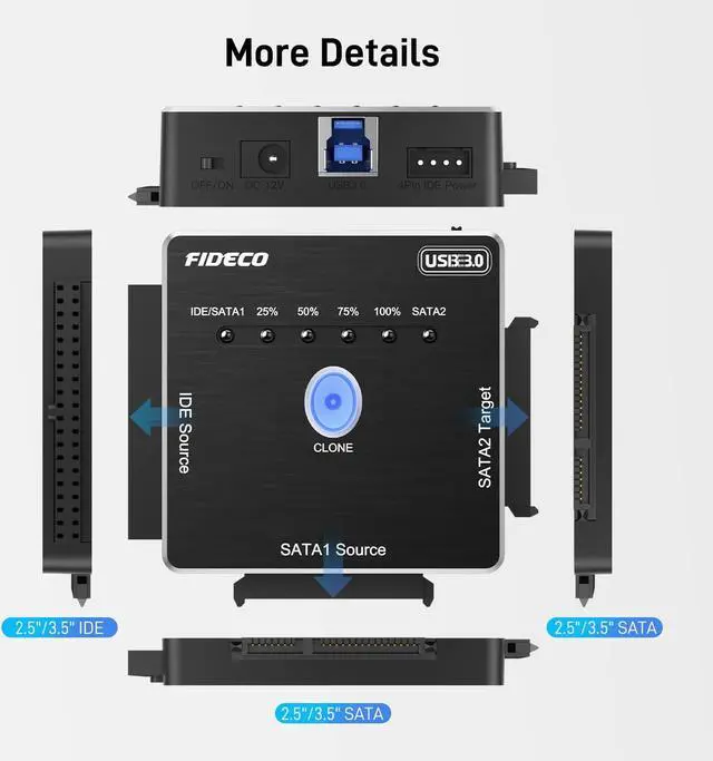Offline CloneFIDECO hard drive converter can support offline clone. No computer is needed! Just press the " CLONE" button for 3 seconds until the first blue light (25%) flashes. You can operate offline clone only in 2 combinations: IDE Source+SATA2 Target; SATA1 Source+SATA2 Target.