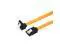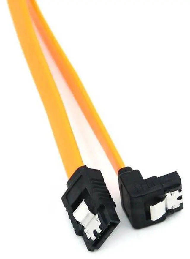 This SATA III cable has a flat, slim appearance and metal latches on each connector to secure it tightly to devices. One end of this durable SATA cable has a 90-degree angled connector, while the other features a straight-head connector. Angled heads work well for tight spaces to help prevent crimping that could damage cables.