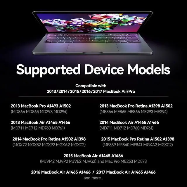 Compatible with Device ModelsCompatible with 2013/2014/2015/2016/2017 MacBook Air/Pro; 2013 MacBook Pro A1493 A1502(MD864MD865 MD293MD294); 2013 MacBook Pro Retina A1398 A1502(ME864 ME865 ME866 ME293 ME294); 2013 MacBook Air A1465 A1466(MD711 MD712 MD760MD761); 2014 MacBook Air A1465 A1466(MD711MD712 MD760MD761); 2014 MacBook Pro Retina A1502 A1398(MGX72 MGX82 MGX92 MGXA2 MGXC2); 2015 MacBook Pro Retina A1502 A1398(MF839 MF840 MF841 MGXA2 MGXC2); 2015 MacBook Air A1465 A1466(MJVM2 MJVP2 MJVE2 MJVG2) and MaC Pro ME253 MD878; 2016 MacBook Air A1465 A1466/2017 MacBook Air A1465 A1466and more...