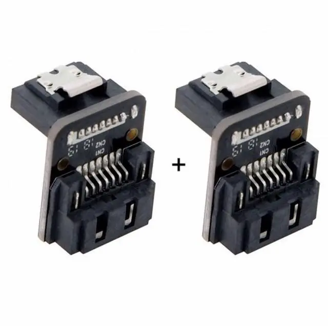 The package included 2pcs same adapters.(up angled). The adapter is designed for changing SATA 7pin Disk cable installation direction.