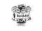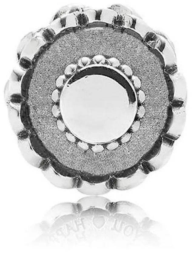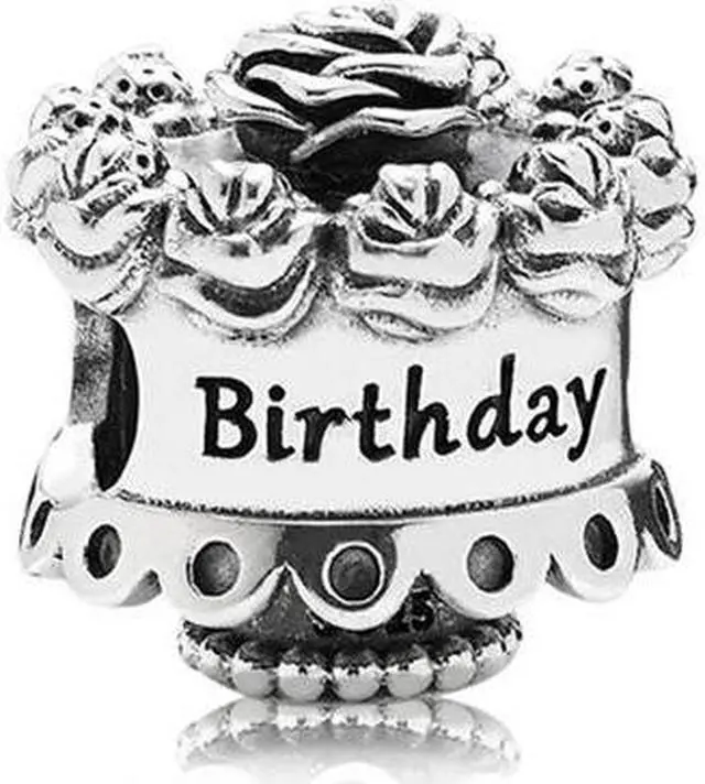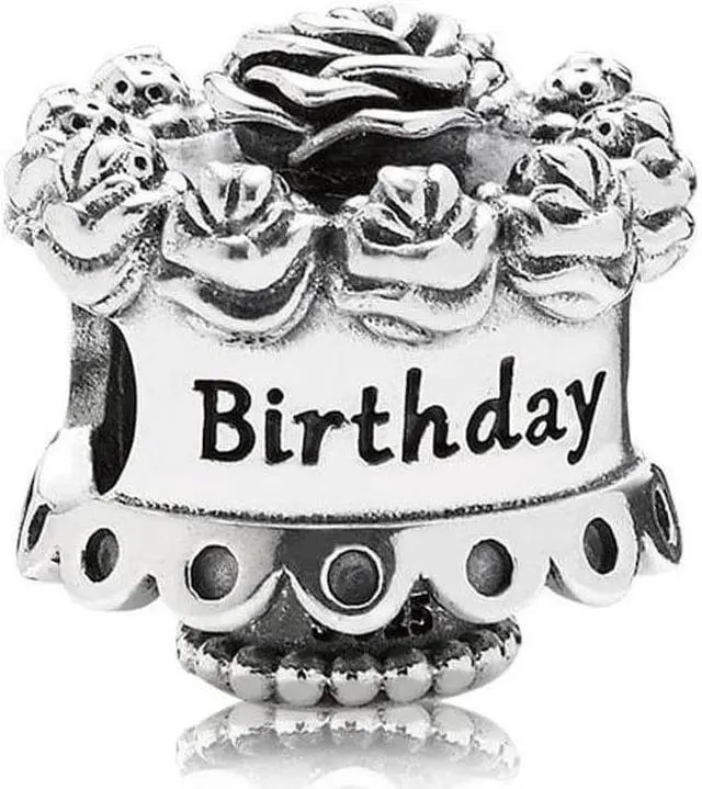 A delicious sterling silver cake charm with the words birthday engraved on the side of it.