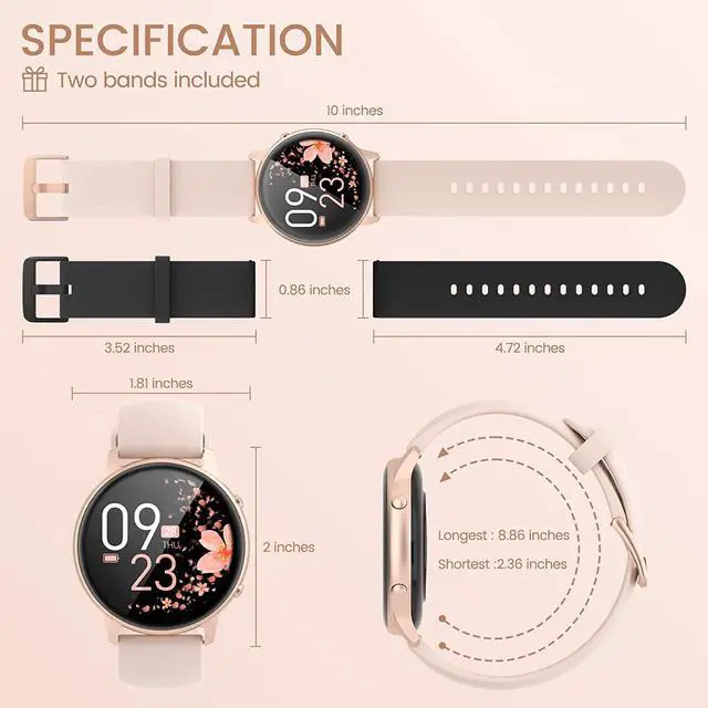 - Style You Can Count On - The Smart Watch For Women Adopts A Borderless Design And An Rose Gold Aerometal Aluminum Alloy Bezel, Also We Have Prepared Pink And Black Two Bands To Enhance Your Most Fashionable Outfits. And A 1.28'' Tempered Hd Lcd With Ips Technology For Enhanced Color And Clarity. With A Light 0.1Lb Weight, A Thickness Of 0.25'', And A Skin-Friendly Silicone Strap, Allows You To Enjoy The Lightness Of Time.
