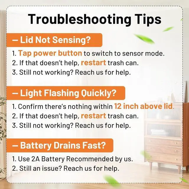 A: There should be no objects within 23 inches (60 cm) above the motion sensor of the trash bin. If the indicator light is flashing, it means there is an object affecting the sensor. Please remove any objects or move the trash bin.