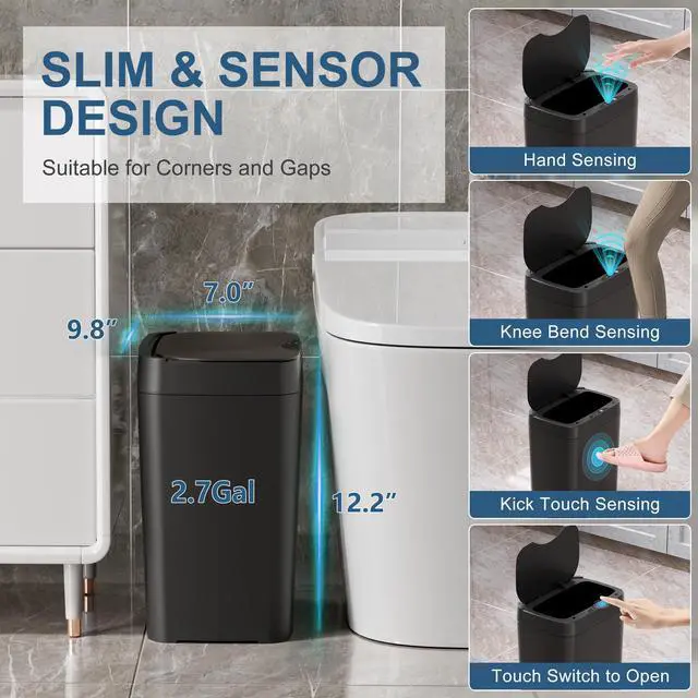 A: The 2.7 gal smart trash can is 12.2" high, 9.8 "long, 7" wide. Suitable for bathroom, toilet, bedroom, living room, kitchen, office, single apartment, and other small space places. If you need more capacity, please buy more than 5 gal cans.