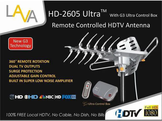 The HD-2605 Ultra with G3 Control Box is our next generation Antenna, it is powerful with built in super low noise amplifier, covers reception ranges up to 125 miles. The HD-2605 HDTV Antenna equipped with Motor Rotor and new G3 Control Box. You don't need to go out to move the antenna for specified direction any more. Just use the remote control inside your house and you can find the best angel for your TV signal. It is One cable solution for all your TVs at home. You don't need to run addition cable for the rotation control.