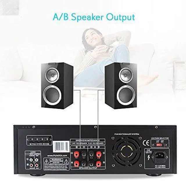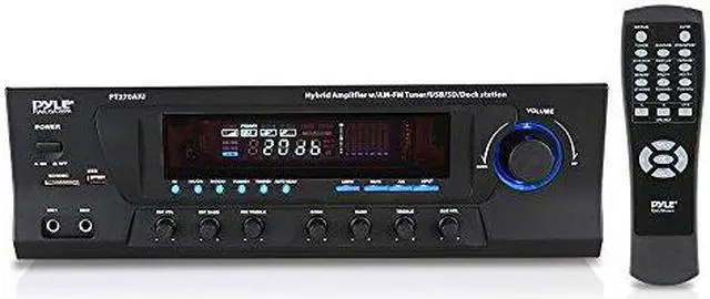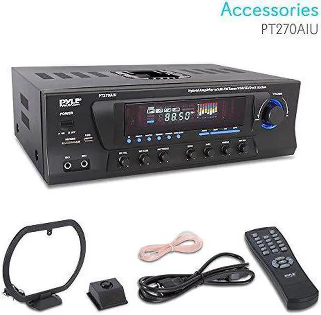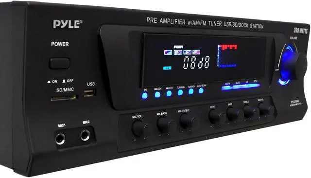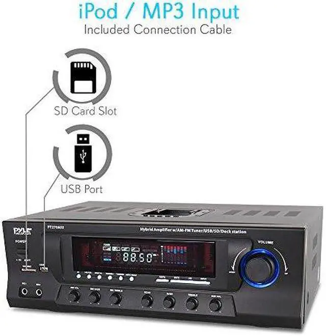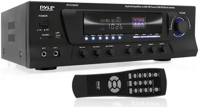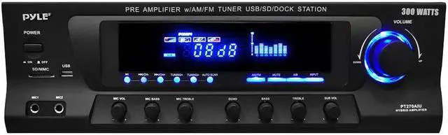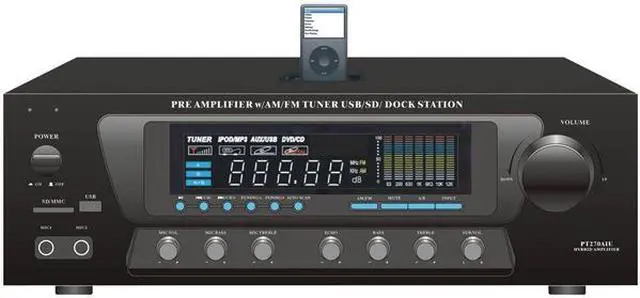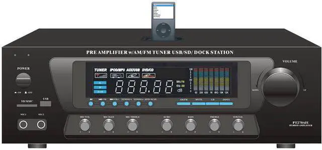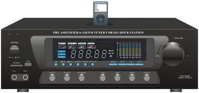 The PT270AIU is a powerful home pre-amplifier that's been updated for the 21st century — now with support for USB, SD cards, and your iPod or iPhone. Now you can charge your iDevice while playing it back or while using the stereo RCA input on the back. This pre-amp is also equipped with an AM/FM radio with auto-seek and capable of storing up to 50 radio station presets. With a maximum output of 600 Watts, the PT270AIU has the power to fill your room with sound. On the front, two 1/4" microphone inputs allow you to sing along to your music, making the PT270AIU the perfect amplifier for karaoke parties. You can even add an echo effect to your voices. Outputs include banana-plug speaker terminals, plus two mono RCA outputs dedicated for the subwoofer output, which has its own separate gain control. Control multiple sets of speakers with the A/B speaker out switch. The digital fluorescent display on the front beautifully displays the levels of the input audio. 110 and 220V switchable.