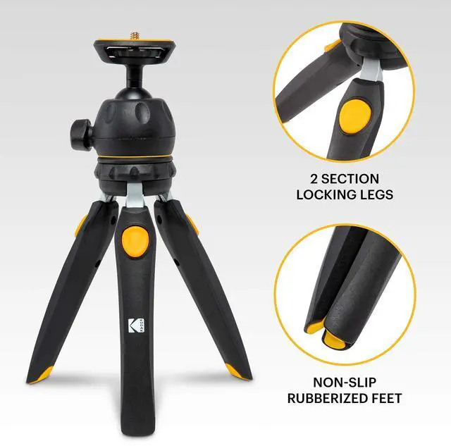 Still shots to fabulous selfies-in five seconds flat. Whether youre capturing a sprawling landscape close-up portrait or daily selfie the perfect shot requires balance and control. Now you can enhance your craft in any setting with the Photo Gear Mini Adjustable Tripod from KODAK. This convertible system replaces your bulky equipment by combining two important tools into one compact convenient package. When shooting subjects that require stability and balance the 9 tabletop tripod holds your camera steady while providing seamless movement and 5-position height adjustment. Simply fold up the legs to convert to an 11 selfie stick-great for taking self-portraits action photography and other handheld applications.