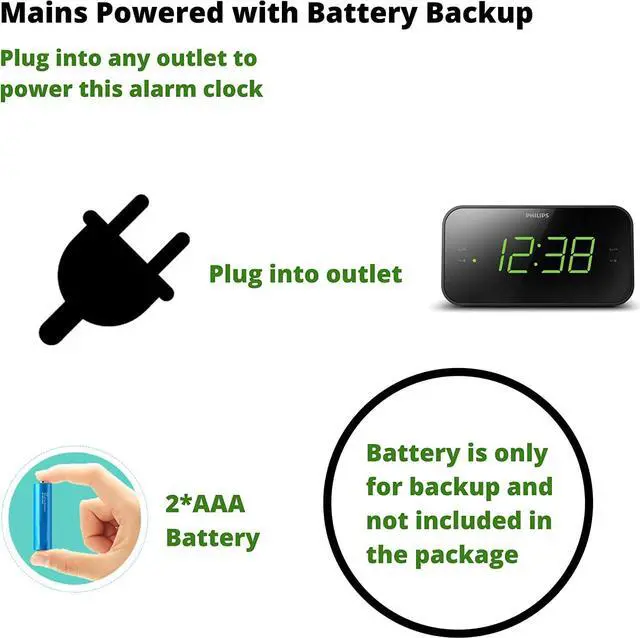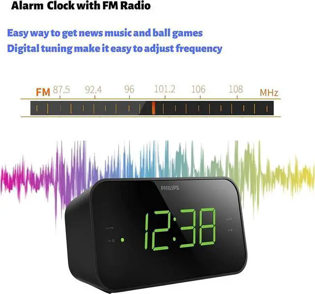 Clear, simple display with large clock digits Tell the time at a glance with this FM alarm clock radio. The large digits mean the display is easy to see from any angle, and you can adjust the brightness to suit your room. Simple controls take care of setting the alarm, volume, and tuning. Dual alarm function. Set two alarms Dual alarm function. Set two alarms The dual alarm function lets you set two alarms, both of which can be set to use either an alarm tone or the radio.