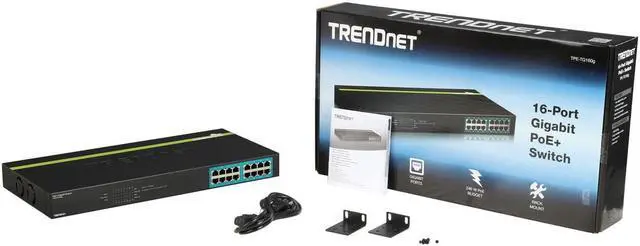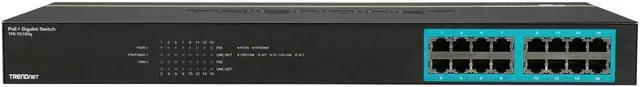 TRENDnet's 16-Port Gigabit PoE+ Switch, model TPE-TG160g, offers 16 x Gigabit PoE+ ports, a 32 Gbps switching capacity, and a PoE power budget of 246 Watts. This rugged metal switch comes with a rack mount kit.PoE Camera Flexibility The switch recognizes non-PoE, PoE (15.4 W), and PoE+ (30 W) cameras (or other PoE devices) and supplies the required amount of power automatically.Full PoE Power The large 246 Watt PoE power budget supplies full PoE power to every port, thereby maximizing the number of allowable connected PoE devices.Gigabit Networking All Gigabit ports produce a 32 Gbps switching capacity and support Jumbo Frames up to 10Brand Name: TRENDnetEthernet Technology: Gigabit EthernetForm Factor: Rack-mountableLayer Supported: 2Manageable: NoMedia Type Supported: Twisted PairNetwork Technology: 10/100/1000Base-TPoE (RJ-45) Port: NoPort/Expansion Slot Details: Gigabit EthernetPower Source: Power SupplyProduct Type: Ethernet SwitchStack Port: NoTotal Number of Network Ports: 16BasicBrand Name: TRENDnetEthernet Technology: Gigabit EthernetForm Factor: Rack-mountableLayer Supported: 2Manageable: NoMedia Type Supported: Twisted PairNetwork Technology: 10/100/1000Base-TPoE (RJ-45) Port: NoPort/Expansion Slot Details: Gigabit EthernetPower Source: Power SupplyProduct Type: Ethernet SwitchStack Port: NoTotal Number of Network Ports: 16Battery InformationPower Source: Power SupplyGeneral InformationBrand Name: TRENDnetManufacturer: TRENDnetManufacturer Part Number: TPE-TG160GPackage Contents: 16-Port Gigabit PoE+ SwitchQuick Installation GuideRack mount kitPower cordProduct Model: TPE-TG160GProduct Name: 16-Port Gigabit PoE+ SwitchProduct Type: Ethernet SwitchInterfaces/PortsBypass: NoEthernet Technology: Gigabit EthernetLRE Port: NoManagement Port: NoModular: NoNumber of PoE+ (RJ-45) Ports: 16PoE (RJ-45) Port: NoPort/Expansion Slot Details: Gigabit EthernetStack Port: