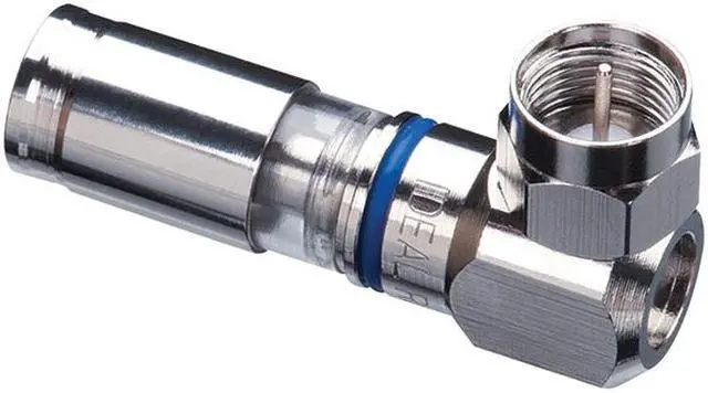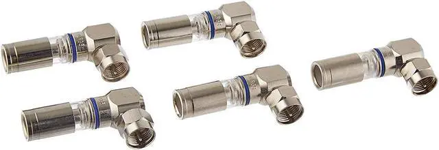 The InSITE RTQ RG6 and RG6 Plenum 90deg F connector from Ideal comes in pack of 5. It features InSITE technology, which gives installers a large, clear, 360deg visual indication that the coaxial cable has been correctly and completely inserted into the connector. It\'s great for CATV and satellite connections.. Patented RTQ compression sleeve provides weatherproof seal at cable entry point. Robust, all-brass exterior. For indoor/outdoor use in application & installations from 5MHz to 3GHz, including CATV, satellite, HDTV & other A/V-based applications. Connectors fit regular through quad cables.