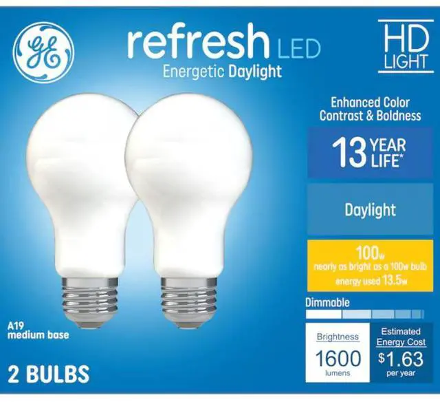 GE Refresh HD Daylight LED 100-Watt Replacement A19 light bulbs provide enhanced color contrast and boldness versus standard LED bulbs. The high definition daylight light helps create an energetic light thats ideal for active spaces like playrooms, home offices, laundry rooms, basements and garages. Theyre dimmable and illuminate your home with a cool, bluish-white light. These are great for frequently used fixturesthis GE Refresh HD Daylight LED bulb is rated to last 13 years and cost just 1.63 to operate each year based on 3 hours use per day at 0.11 per kilowatt hour.