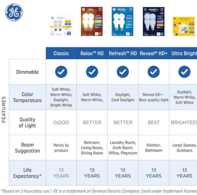 GE Relax HD Warm White LED 60-Watt Replacement light bulbs provide enhanced color contrast and boldness versus standard LED bulbs. The high definition warm white light helps create a comfortable, cozy light thats ideal for bedroom lighting, foyer lighting, family rooms and dining rooms. Theyre dimmable and illuminate your home with soft white light. These are great for frequently used fixturesGE Relax HD Warm White LED bulbs are rated to last 13 years based on 3 hours per day use and save in energy costs over the bulb's life versus a 60-Watt incandescent bulb.