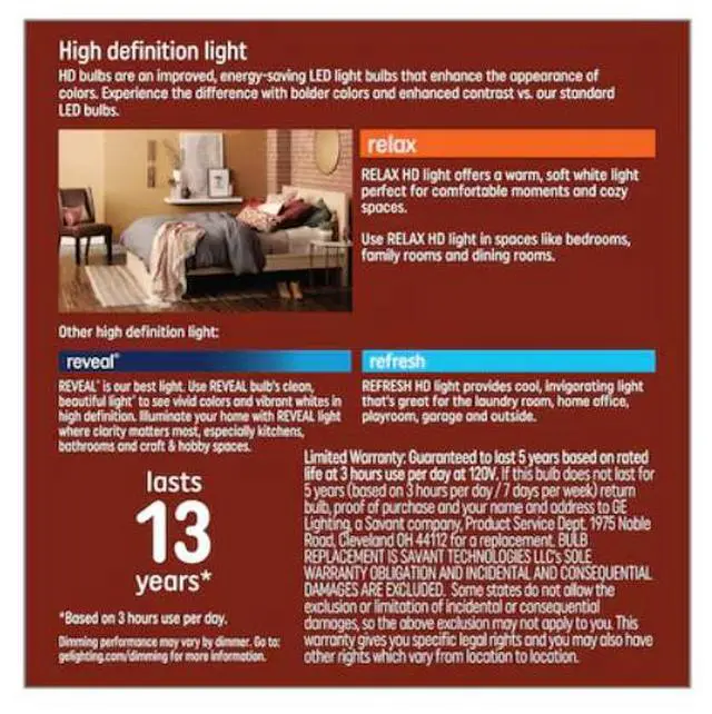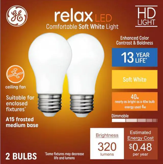 GE Relax HD Soft White LED 40-Watt Replacement Frosted Finish A15 Ceiling Fan light bulbs provide enhanced color contrast and boldness versus standard LED bulbs. The high definition soft white light helps create a comfortable, cozy light thats ideal for bedroom lighting, foyer lighting, family rooms and dining rooms. Theyre dimmable and illuminate your home with soft white light. These are great for frequently used fixturesGE Relax HD Soft White LED bulbs are rated to last twice as long as GE Basic LED bulbs and save 59 dollars on energy costs over the bulb's life versus a 40-Watt A15 incandescent bulb.