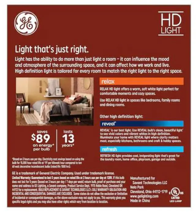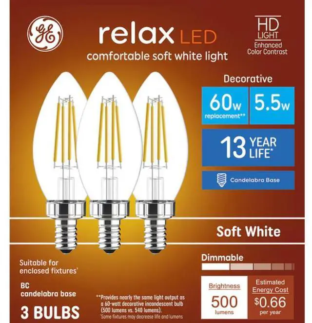 GE Relax HD Soft White LED 60-Watt Replacement Clear Finish Blunt Tip decorative light bulbs provide enhanced color contrast and boldness versus standard LED bulbs. The high definition soft white light helps create a comfortable, cozy light thats ideal for bedroom lighting, foyer lighting, family rooms and dining rooms. Theyre dimmable and illuminate your home with soft white light. These decorative bulbs are great for frequently used fixturesGE Relax HD Soft White LED bulbs are rated to last twice as long as GE Basic LED bulbs and save 89 dollars on energy costs over the bulb's life versus a 60-Watt decorative incandescent bulb.