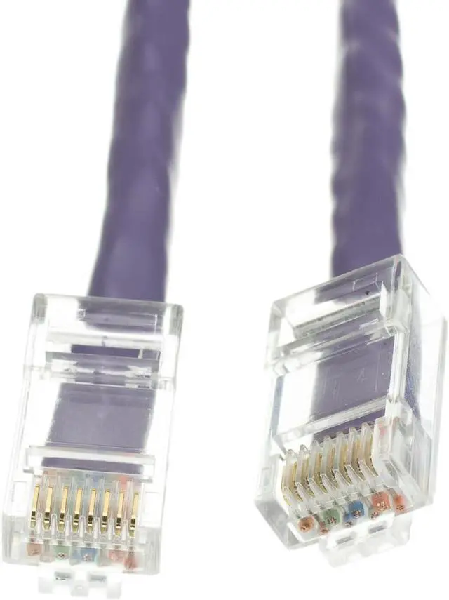 Cat5e Ethernet cables of the 50 foot length have a variety of uses. These cables will provide a greater reach for those situations that require more serious distances. These Ethernet Cables are great for the home office or any other environment.This particular cable is a purple UTP (Unshielded Twisted Pair) bootless patch cable. The connectors are wired to the T568B standard. The individual conductors are 24 AWG (American wire gauge) stranded pure copper. Cat5e patch cables are stranded to improve flexibility. Pure copper conductors provide the best signal possible. The RJ45 plug features gold connectors to prevent corrosion thus ensuring a longer cable life. Our Cat5e Ethernet patch cable exceed the EIA/TIA-568-C standard.