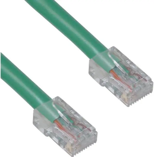 10 foot Cat5e Green Ethernet Network Patch Cable, Bootless. Cat5e Ethernet cables of the 10 foot length have a variety of uses. These cables will suffice for connecting routers/switches to Cable/DSL modems, computers to routers/switches or even in the server/network room for connecting ports on patch panels. These Ethernet Cables are great for the home office or any other environment. This particular cable is a green UTP (Unshielded Twisted Pair) bootless patch cable. The individual conductors are 24 AWG (American wire gauge) stranded pure copper. Cat5e patch cables are stranded to improve flexibility. Pure copper conductors provide the best signal possible. The RJ45 plug features gold connectors to prevent corrosion thus ensuring a longer cable life. Our Cat5e Ethernet patch cables exceed the EIA/TIA-568-C standard.
