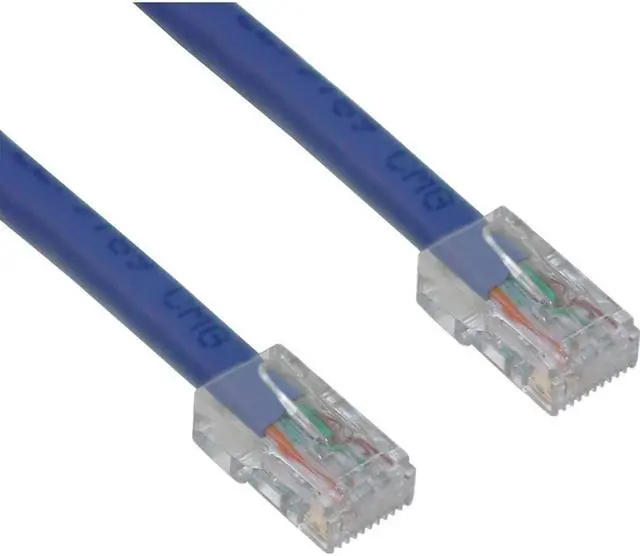 14 foot Cat5e Blue Ethernet Network Patch Cable, Bootless. Cat5e Ethernet cables of the 14 foot length have a variety of uses. These cables will suffice for connecting routers/switches to Cable/DSL modems, computers to routers/switches, computers to other computers/laptops or even in the server/network room for connecting ports on patch panels. These Ethernet Cables are great for the home office or any other environment. This particular cable is a blue UTP (Unshielded Twisted Pair) bootless patch cable. The connectors are wired to the T568B standard. The individual conductors are 24 AWG (American wire gauge) stranded pure copper. Cat5e patch cables are stranded to improve flexibility. Pure copper conductors provide the best signal possible. The RJ45 plug features gold connectors to prevent corrosion thus ensuring a longer cable life. Our Cat5e Ethernet patch cables exceed the EIA/TIA-568-C standard.