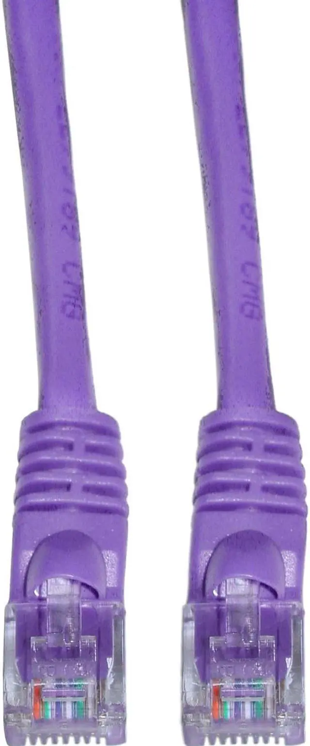 14 foot Cat5e Purple Ethernet Network Patch Cable, Snagless/Molded Boot. Cat5e Ethernet cables of the 14 foot length have a variety of uses. These cables will suffice for connecting routers/switches to Cable/DSL modems, computers to routers/switches, computers to other computers/laptops or even in the server/network room for connecting ports on patch panels. These Ethernet Cables are great for the home office or any other environment. This particular cable is a purple UTP (Unshielded Twisted Pair) patch cable with molded boots (snagless installation) and extra protection for the RJ45 connector and clip. The individual conductors are 24 AWG (American wire gauge) stranded pure copper. Cat5e patch cables are stranded to improve flexibility. Pure copper conductors provide the best signal possible. The RJ45 plug features gold connectors to prevent corrosion thus ensuring a longer cable life. Our Cat5e Ethernet patch cables exceed the EIA/TIA-568-C standard.