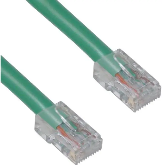 14 foot Cat5e Green Ethernet Network Patch Cable, Bootless. Cat5e Ethernet cables of the 14 foot length have a variety of uses. These cables will suffice for connecting routers/switches to Cable/DSL modems, computers to routers/switches, computers to other computers/laptops or even in the server/network room for connecting ports on patch panels. These Ethernet Cables are great for the home office or any other environment. This particular cable is a green UTP (Unshielded Twisted Pair) bootless patch cable. The individual conductors are 24 AWG (American wire gauge) stranded pure copper. Cat5e patch cables are stranded to improve flexibility.