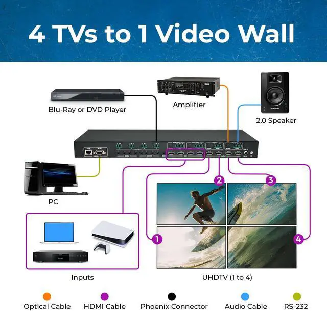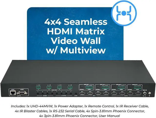 The UHD-44MVW is a powerful matrix device that can take 4 inputs to 4 outputs and allows you to switch between them with ease. It supports resolutions up to 4K@60Hz with 18Gbps video bandwidth. The device features both Video Wall and Multiviewer functionality making it useful in a wide range of applications. It features 09 different Video Wall modes and 12 different Multiview modes. Optical and L/R outputs for audio extraction, and IR inputs & outputs for IR Matrixing. Versatile control through RS-232 or TCP/IP. This device is perfect for various commercial and personal applications.