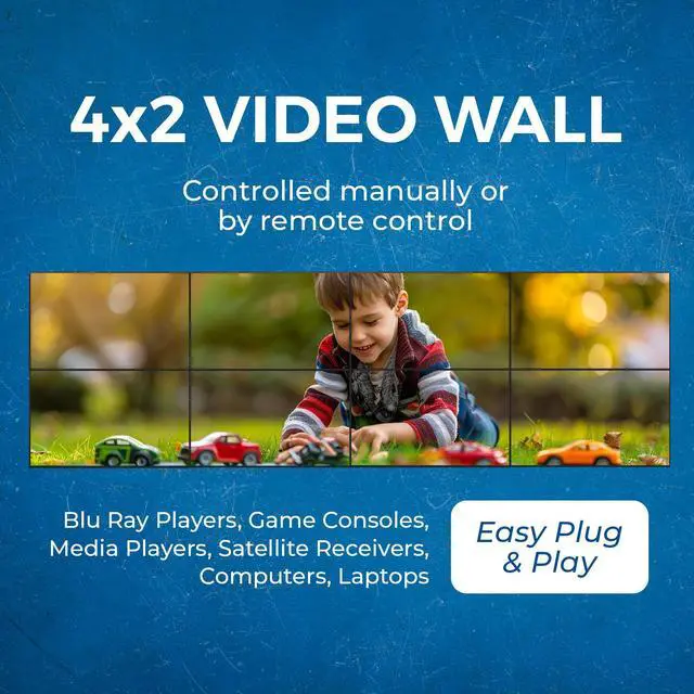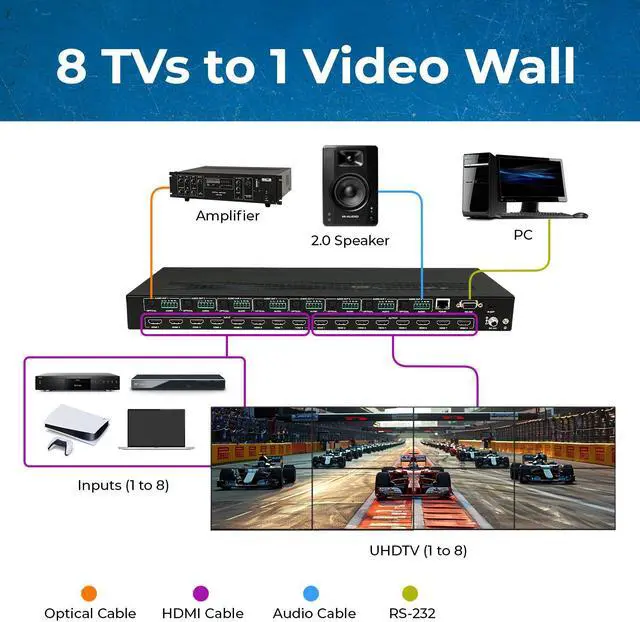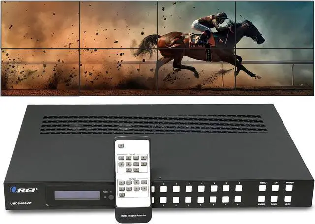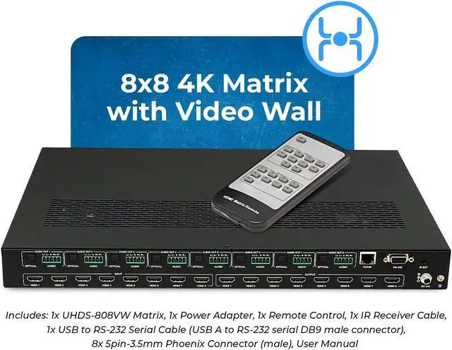 The UHDS-808VW is an 8x8 Matrix that allows you to switch between 8 media sources and output them on 8 displays. It features 8 HDMI inputs and outputs, supporting video resolutions up to4K@60Hz and 2K@60Hz with an 18Gbps video bandwidth and HDCP 2.2 compliance. The device offers seamlesswitching and features Optical and 5-pin phoenix Analog audio outputs for audio extraction. Additionally, it functions as a video wall controller, enabling various setups like 4x2, 2x2, 8x1, etc. It offers horizontal and vertical mirror options to flip the image 180 degrees for bezel adjustment.