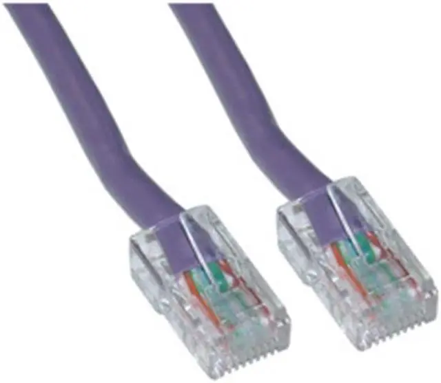 Cat5e Ethernet cables of the 14 foot length have a variety of uses. These cables will suffice for connecting routers / switches to Cable / DSL modems, computers to routers / switches, computers to other computers / laptops or even in the server / network room for connecting ports on patch panels. These Ethernet Cables are great for the home office or any other environment.This particular cable is a purple UTP (Unshielded Twisted Pair) bootless patch cable. The connectors are wired to the T568B standard. The individual conductors are 24 AWG (American wire gauge) stranded pure copper. Cat5e patch cables are stranded to improve flexibility. Pure copper conductors provide the best signal possible. The RJ45 plug features gold connectors to prevent corrosion thus ensuring a longer cable life. Our Cat5e Ethernet patch cable exceed the EIA / TIA-568-C standard.