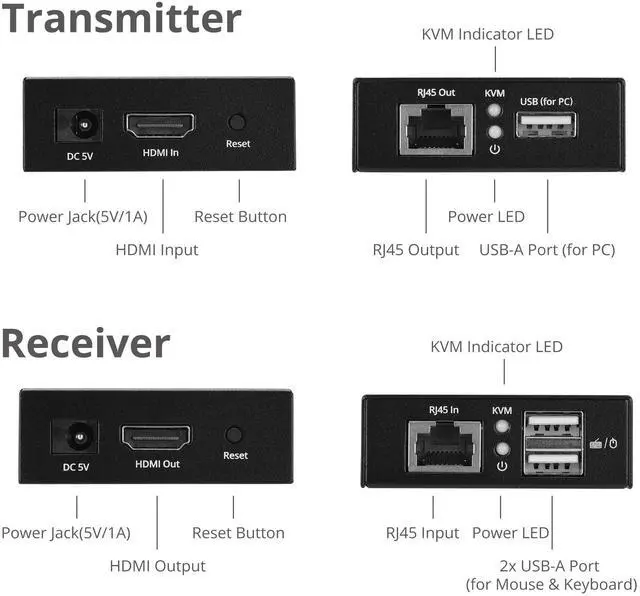 4:4: 4 8-bit to deliver a clear picture quality, and supports High Dynamic Range (HDR) 10 for enhanced video qualityProtection Components Supports ESD protection, lightning protection, and surge protection to safe your electronic equipmentMultiple Connectivity Ports Comes with one HDMI video input port, one USB Type-A port for PC host connection, one HDMI video output port, two USB Type-A ports for connecting keyboard and mouse, one RJ45 input port, one RJ45 output port, two DC 5V/1A power jack and two reset buttonsMaximum Compatibility Supports Plug-n-play and no driver installation required. The reset button allows displays to be re-detected if no displays are detected. Automatically adjusts parameters to match different network cables and achieve the best display performanceCompact Metal Housing Design It features a high-quality surface metal housing that efficiently dissipates heat, ensuring system stability and trouble-free operation More from the Manufacturer
