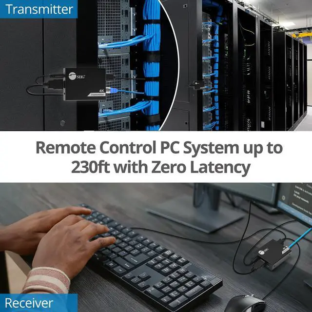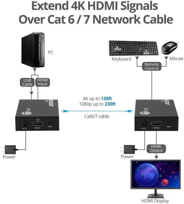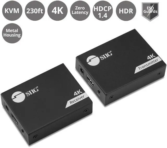HDMI KVM Extender transmits HDMI 1080p and USB signals up to 230ft (70m) over single Cat6/7 cable with zero latency, and 4K@30Hz up to 130ft (40m), allows you to control computer from a remote location with a USB keyboard and mouse, HDCP 1.4, HDR 10, Reset Button, ESD Protection, Metal HousingExtending HDMI and USB Signals Easily extend HDMI audio/video and USB signals up to 230ft (70m) through a Cat6/7 network cable to remote 1080p display with zero latency and 4K@30Hz transmission distance is up to 130ft (40m), allow you to use a one set of keyboard & mouse for remote controlKeyboard and Mouse Control Delivers three USB Type-A ports, two for independent HID keyboard & mouse to control your PC system from a remote location and one for Host connection such as Laptop or Desktop.