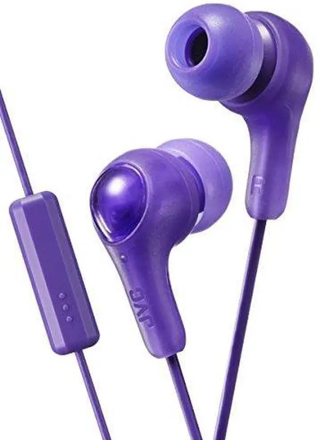 PURPLE GUMY In ear earbuds with stay fit ear tips and MIC. Wired 3.3ft colored cord cable with headphone jack. Small, medium, and large ear tip earpieces included. JVC GUMY HAFX7MV