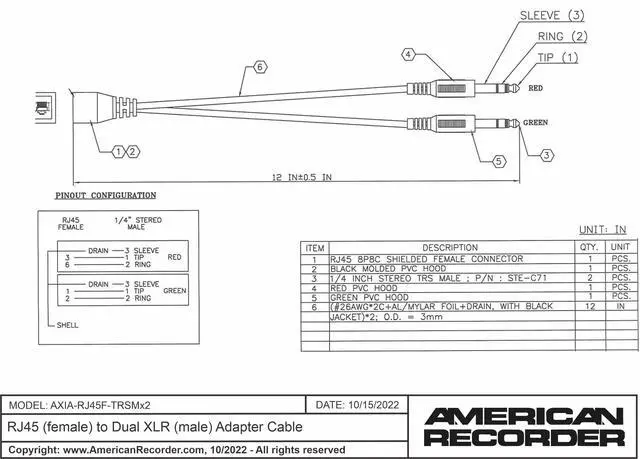 This is a passive cable which features a female RJ45 to two balanced male 1/4" TRS connectors that are color coded of easy identification.