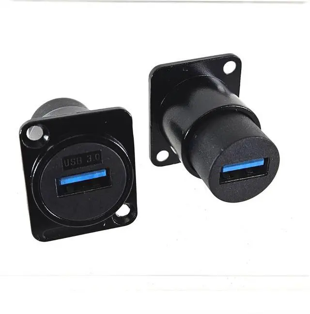 This USB 3.0 D-type panel mount connector features a nickel bezel and a pass-through design, providing USB A connections on both the front and rear sides for seamless integration.