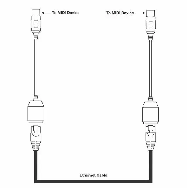 Easily connect musical devices MIDI connections using an Ethernet cable. Simply plug these adapters into the MIDI jacks of each device and then connect the desired length Ethernet cable.