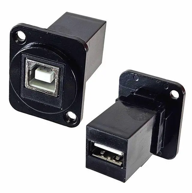 This D Type chassis panel mount connector features a USB 2.0 B port on the front, routed through to a USB-A port on the back for seamless pass-through connectivity.