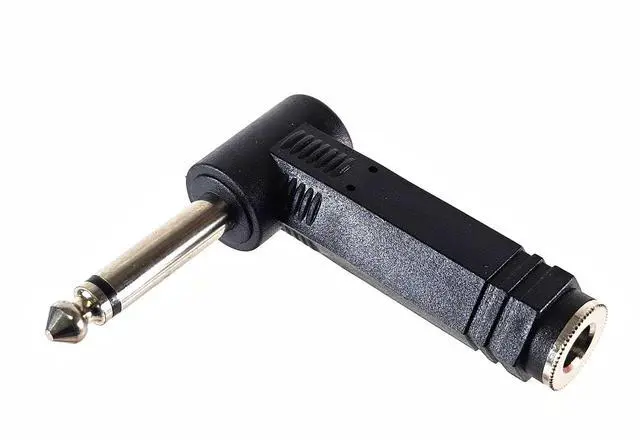 The 1/4 inch Male TS to 1/4 inch TS Female Right Angle Adapter is perfect for situations where a straight connector lacks adequate clearance. It features a high-quality nickel finish protected by a sturdy, insulated plastic overmold for enhanced durability and reliability.