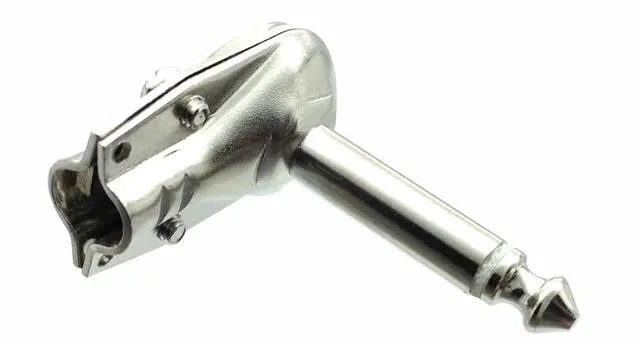 Solder type flat right Angle audio 2 conductor 1/4" plug with nickel plating. This connector's low profile design make it ideal when assembling pedal board patch cables.