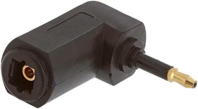 Optical Toslink Jack to Mini Plug Angled Adapter converts TosLink Plug to a Mini Plug. The adapter is assambled of black molded plastic with gold-plated contacts and comes with a dust cap for protection from contamination while not in use. Its angled shape helps fiber optic TosLink cable to fit easily in confined areas.